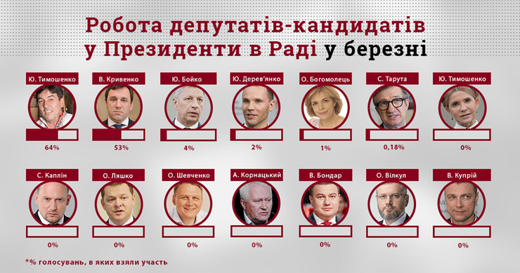 В частности, ни разу не голосовали кандидаты в президенты председатель фракции "Всеукраинское объединение "Батькивщина" Юлия Тимошенко, Александр Шевченко (внефракционный), заместитель председателя фракции "Оппозиционный блок" Александр Вилкул, председатель фракции Радикальной партии Олег Ляшко, сопредседатель группы "Видродження" Виктор Бондарь, Сергей Каплин и Аркадий Корнацкий (оба - фракция "Блок Петра Порошенко") и Виталий Куприй (внефракционный).
