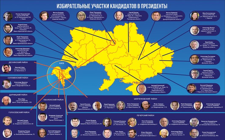 В соответствии с данными Центризбиркома и ГРИ, 24 кандидатов в президенты следует ожидать на избирательных участках в Киеве. При этом только двое из них – самовыдвиженцы Александр Ващенко и Ольга Богомолец – смогут встретиться в одном месте. Их избирательный участок располагается в холле Института физиологии имени А.А. Богомольца.