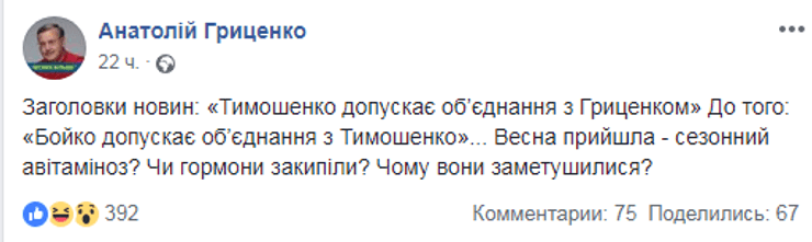 Сексизм Гриценко по отношению к Тимошенко напоминает комплекс поручика Ржевского, – Геращенко