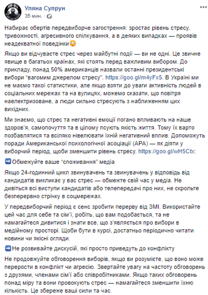 Ульяна Супрун, и.о. главы МОЗ, в Facebook заявила, что в последние дни перед выборами у украинцев растет уровень стресса, тревожности, агрессивного общения и даже проявлений неадекватного поведения.