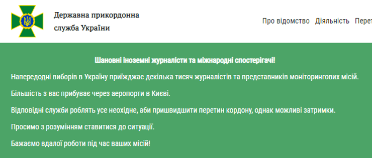 "Накануне выборов в Украину приезжает несколько тысяч журналистов и представителей мониторинговых миссий. Большинство из вас прибывает через аэропорты в Киеве. Соответствующие службы делают все необходимое, чтобы ускорить пересечение границы, однако возможны задержки", - говорится в сообщении.