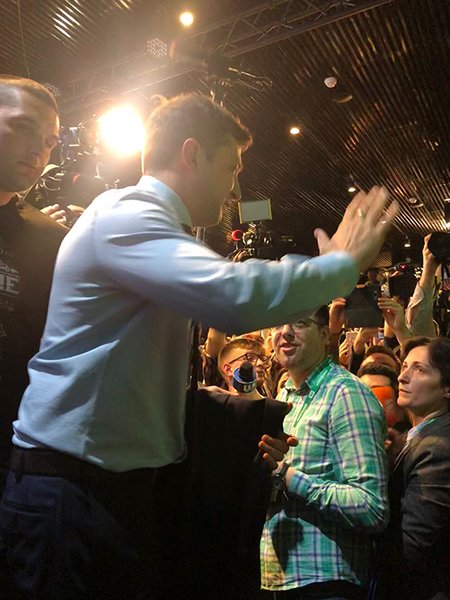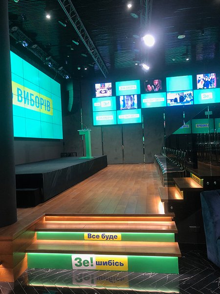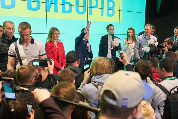 В 20:00 в окружении десятков камер и трех десятков людей Владимир Зеленский буквально, прорывается на сцену. Его жена Елена, одетая во все красное, заметно нервничает. Со стороны кажется, что нервничает и сам Зеленский. Он смущенно улыбается, и шутит, что такого количества телекамер никогда не видел. Действительно, на него смотрит порядка пяти десятков объективов, среди которых много иностранных медиа. Настает Час Че, а скорее Зе и на экране появляются первые данные КМИС. Согласно ним Владимир Зеленский получает 30,4%, Петр Порошенко - 17,8%, Юлия Тимошенко - 14,2%. И тут зал разрывает. Люди с бейджами Зе!Команда начинают истерично обниматься и поздравлять друг друга. У самого Владимира Зелинского слезы на глазах. То ли это действительно эмоции, то ли актерское мастерство, но выглядит вполне искренне. Будто не слыша вопросов и поздравлений, он "начинает давать всем пять" и лишь растерянно улыбаться. После берет себя в руки, становится рядом с женой и дает брифинг.