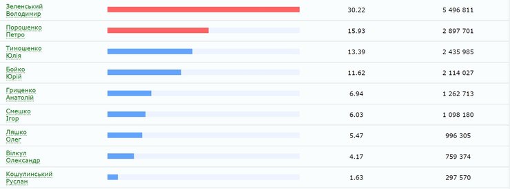 Лидер студии "Квартал 95" Владимир Зеленский набирает 30.22% голосов, действующий президент Петр Порошенко – 15.93%, лидер "Батикивщины" Юлия Тимошенко – 13.39%, представитель "Оппозиционной платформы – За жизнь" Юрий Бойко – 11.62%, лидер Гражданской позиции Анатолий Гриценко – 6.94%, экс-глава СБУ Игорь Смешко – 6.03%, лидер Радикальной партии Олег Ляшко – 5.47%, представитель Оппозиционного блока Александр Вилкул – 4.17%, представитель националистов Руслан Кошулинский – 1,63%.