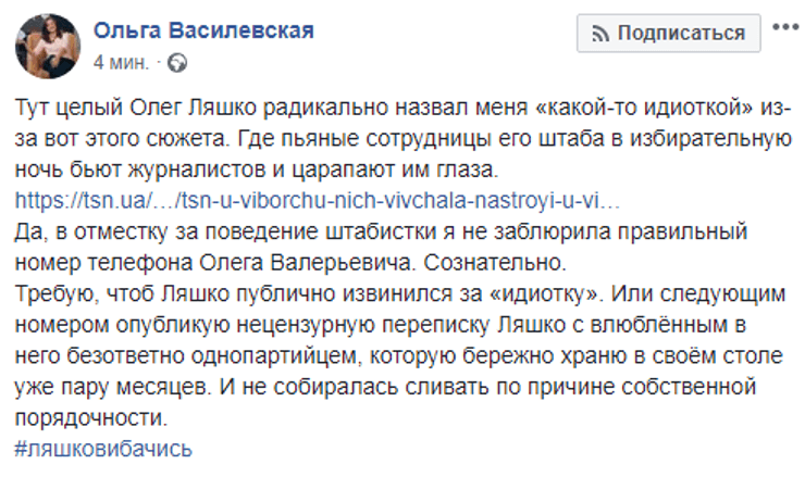 "Тут целый Олег Ляшко радикально назвал меня "какой-то идиоткой" из-за вот этого сюжета. Где пьяные сотрудницы его штаба в избирательную ночь бьют журналистов и царапают им глаза. Да, в отместку за поведение штабистки я не заблюрила правильный номер телефона Олега Валерьевича. Сознательно. Требую, чтоб Ляшко публично извинился за "идиотку". Или следующим номером опубликую нецензурную переписку Ляшко с влюбленным в него безответно однопартийцем, которую бережно храню в своем столе уже пару месяцев. И не собиралась сливать по причине собственной порядочности", - написала в ответ Ольга Василевская.