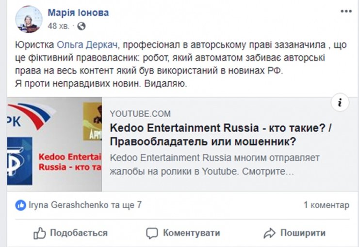 Позже она удалила свой пост. Геращенко сообщила, что юрист Ольга Деркач, которая является профессионалом в авторском праве, пояснила, что "это фиктивный правообладатель, робот, который автоматически забивает авторские права на весь контент, который был использован в новостях РФ".
