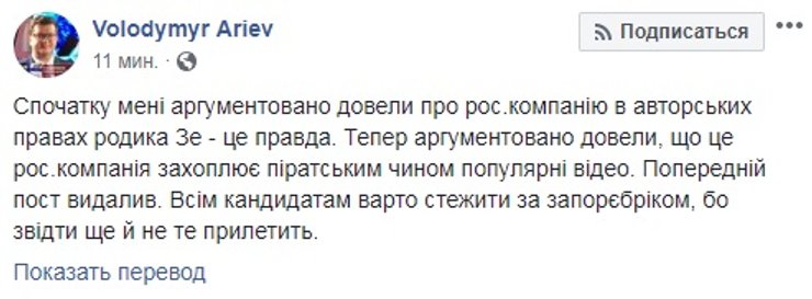 "Только и только Зе! Команда является правомочным владельцем всего аудиовизуального контента, который используется в видеороликах и других видео и аудио продуктах, которые изготовлены и транслируются в рамках избирательной кампании Владимира Зеленского. Таким образом, только Зе! Команда может принимать решения о предоставлении разрешений и порядка использования этих продуктов третьими лицами. Поэтому любые претензии от других компаний к пользователям интернета или СМИ являются безосновательными и неправомочными!", – говорится в сообщении.