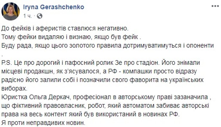 "К фейкам и аферистам отношусь отрицательно. Поэтому фейки удаляю и признаю, если был фейк. PS Это о дорогом и пафосном ролике Зе о стадионе. Его снимали местные продакшн, как выяснилось, а РФ-компашки просто сразу радостно его залили себе и обозначили своего фаворита на украинских выборах", – написала Геращенко.