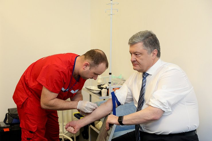 Порошенко снимает пиджак, закатывает рукава белоснежной рубашки, присаживается на кушетку, кладет руку на спинку стула. Медработник в красном костюме берет кровь из вены на правой руке, приступает к манипуляции на левой. Петр Порошенко интенсивно сжимает кулак. В какой-то момент в кадр входят медработники, за их спинами скрывается весь процесс. Вскоре все расходятся. Порошенко произносит: "Не расстраивайтесь, не переживайте, все хорошо". А после просит медика: "Покажите на камеру, что все – правда". Тот демонстрирует пробирку. "У вас очень легкая рука", – замечает президент, опуская рукава. Он поднимается с кушетки и в сопровождении медиков выходит из зала. Через пять минут возвращается и подходит к микрофонам.