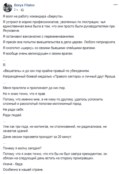 "Я устроил в мэрию профессионалов, уволенных по люстрации, чья единственная вина была в том, что они просто были руководителями при Януковиче. Я остановил вакханалию с переименованиями. Я пресек все попытки вмешательства в дела церкви. Любого патриархата. Я сколотил "ширку" со своими бывшими злейшими врагами. Я вообще очень великодушен к своим врагам", - пишет Борис Филатов.