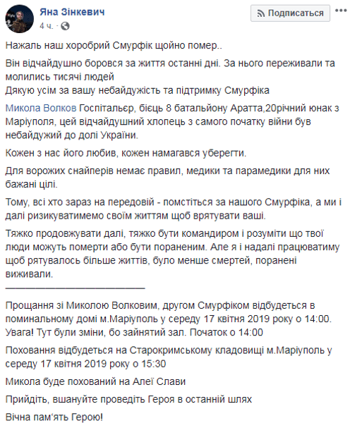 "Николай Волков, друг Смурфик - молодой 20-летний юноша из города Мариуполь, который с молодого возраста был неравнодушным к нашей Украине и ее судьбе. В июне 2018 он прошел наш учебный центр, и с 1 июля поехал на свою первую ротацию в составе нашего батальона. С осени 2018 года он был закреплен к 8 батальону УДА "Аратта" и ежедневно нес тяжкую ношу добровольца-парамедика", - рассказала Зинкевич о погибшем.