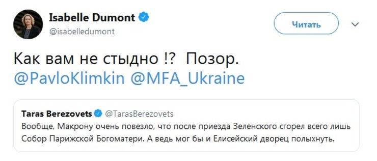 Посол Франции в Украине Изабель Дюмон прокомментировала неудачную шутку политтехнолога и ведущего телеканала "Прямой" Тараса Березовца касательно "причины" пожара в Соборе Парижской Богоматери.