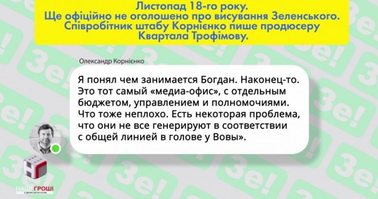 ""Квартал", "Дядя", "Нижние" и "Регионы" - так описал структуру штаба Зеленского в разгар предвыборной кампании координатор Зе-команды Александр Корниенко в переписке с исполнительным продюсером "Квартала" Сергеем Трофимовым", - говорится в публикации.
