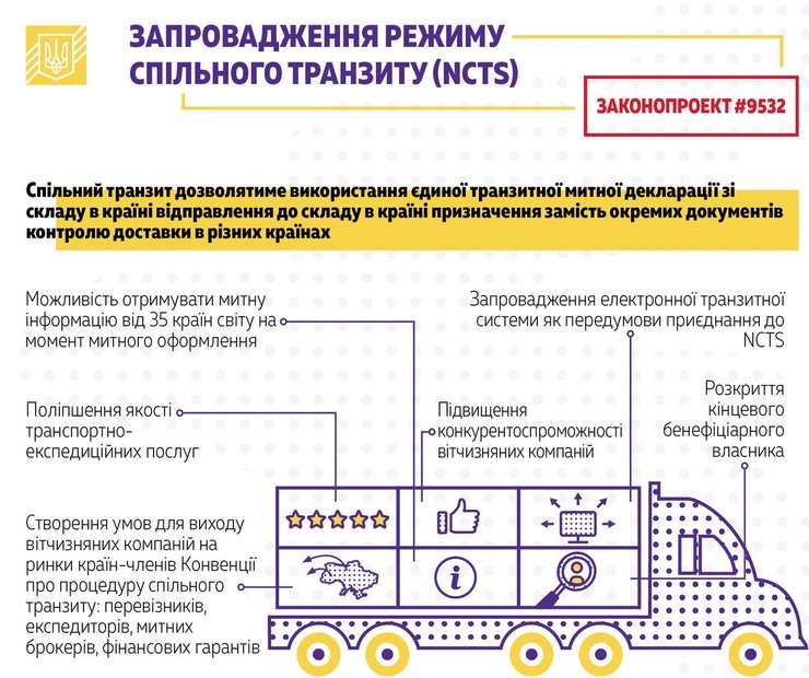 Принятие закона позволит применять Украины европейские транзитные правила, что позволит предприятиям использовать единую таможенную декларацию и единственную гарантию для перемещения товаров от своего состава в состав контрагента.