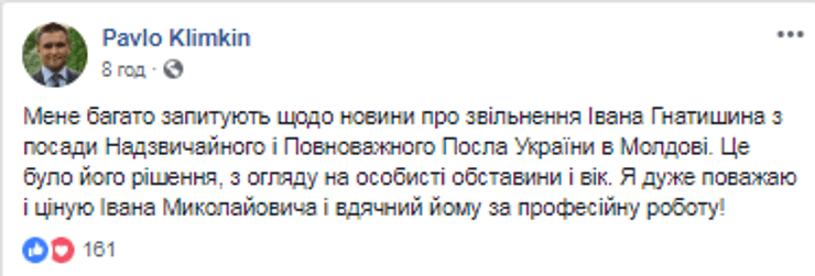 "Меня многие спрашивают относительно новости об увольнении Ивана Гнатишина с должности Чрезвычайного и Полномочного Посла Украины в Молдове. Это было его решение, учитывая личные обстоятельства и возраст. Я очень уважаю и ценю Ивана Николаевича и благодарен ему за профессиональную работу", - написал Павел Климкин.