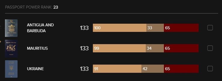 В обновленном рейтинге паспортов мира Global Passport Power Rank украинский паспорт поднялся на 23 позицию. Теперь украинцам доступны для поездок 133 страны: в 91 страну визы не нужны вообще, еще в 42 странах достаточно оформить так называемую "визу по прибытию", подтверждаемую в аэропорту.