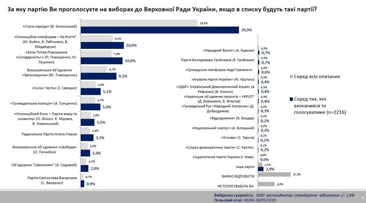 5%-ный барьер прошли бы шесть партий, среди которых "Слуга народа" (29,5% среди всех опрошенных и почти 39,9% серди тех, кто придет на выборы и определился), "Оппозиционная платформа - За життя" (8,1% и 9,9%), "Блок Петра Порошенко" (7,8% и 10,6%), "Батькивщина" (6,7% и 9,1%), "Сила и честь" Игоря Смешко (3,8% и 5,1%) и "Гражданская позиция" Анатолия Гриценко (3,7 и 5,0%).