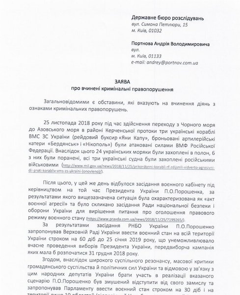 По слова Портнова, Порошенко "причастен к госизмене": в заявлении говорится, что бывший президент своим приказом отправил корабли ВМС Украины в Керченский пролив, в результате чего в плен к РФ попали 24 украинских моряка.