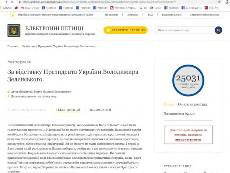 Электронная петиция "За отставку президента Владимира Зеленского" почти за двое суток набрала 25 тысяч голосов, необходимых для ее рассмотрения главой государства.