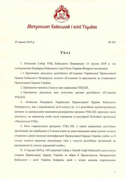 "Любые документы и распоряжения от имени религиозного объединения УПЦ КП, которое прекратило свою деятельность, выданные после 30 января 2019, является недействительными и не подлежат исполнению в Украинской православной церкви (Православной церкви Украины)", - сказано в документе.