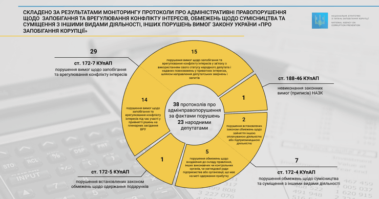 Составлено 38 протоколов об административных правонарушениях по фактам нарушений 23 народными депутатами требований закона Украины "О предотвращении коррупции" по следующей квалификации:
