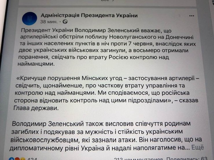 "Это не фейк. Это официальная страница новой АП... Президент Зеленский надеется, что российская сторона возобновит свой контроль над подразделениями! Речь идет о контроле над оккупационными войсками, и Зеленский надеется, что РФ не уйдет, не заберет свое оружие и технику с украинской земли, не выведет своих наемников, а.... восстановит свой контроль над подразделениями. Открою "тайну" – у РФ есть полный контроль над так называемой "властью" так называемых ОРДЛО, и 400 км украинской границы", – пишет Геращенко.