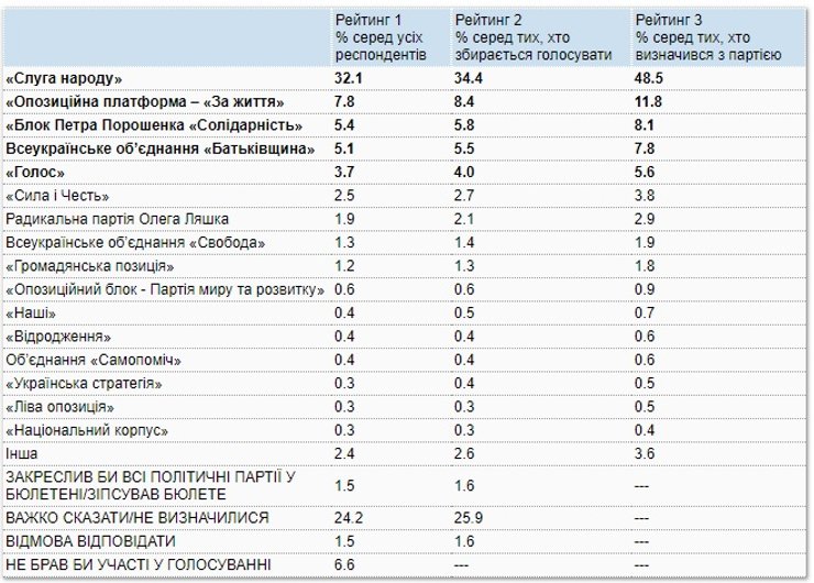 - Согласно данным соцпроса "Рейтинга", который проводился с 29 мая по 3 июня, партию "Слуга народа", поддерживали 48,2% тех, кто намерен голосовать и определился с выбором. За "Оппозиционную платформу - За жизнь" тогда готовы были проголосовать 10,7% определившихся, за "Европейская Солидарность" – 7,8%, за ВО "Батькивщина" – 6,9%, за партию "Сила и честь" – 5,6%.