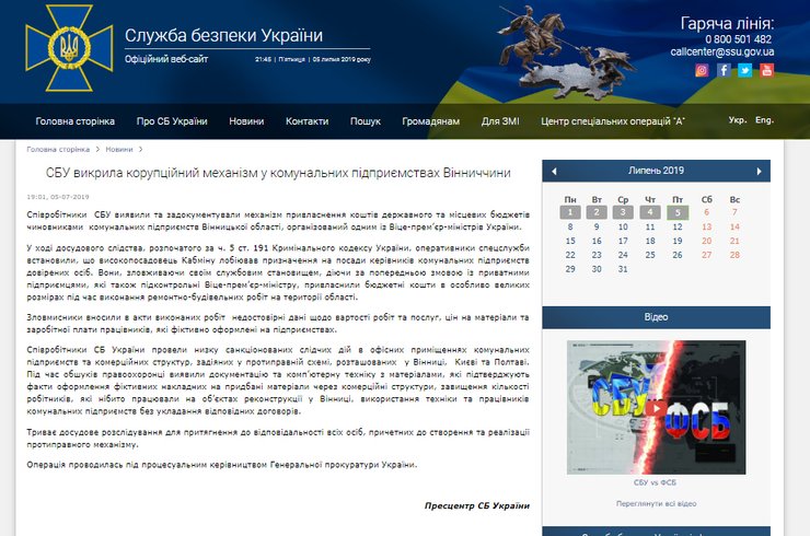 С официального сайта и Facebook-страницы Службы безопасности Украины исчезли сообщения о разоблачении преступной схемы присвоения средств государственного и местных бюджетов чиновниками коммунальных предприятий Винницкой области, организованной одним из вице-премьер-министров.