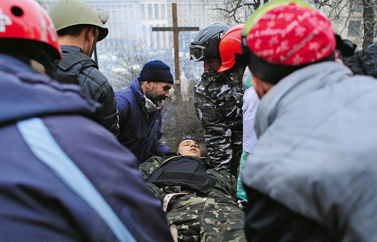 Люди с ярко-желтыми повязками на рукаве (судя по всему, это был знак, по которому они опознавали друг друга) появились у Октябрьского дворца примерно в девять утра. Эту группу впоследствии назвали черной ротой "Беркута". Они открыли огонь по находившимся на Майдане безоружным людям в пластмассовых касках и с деревянными щитами. Один из стрелявших — киевский беркутовец Николай Симисюк. Спустя несколько минут после произведенных им выстрелов из помпового ружья в сторону Майдана он погиб.