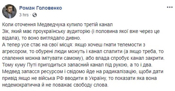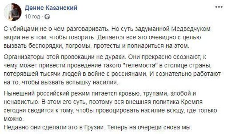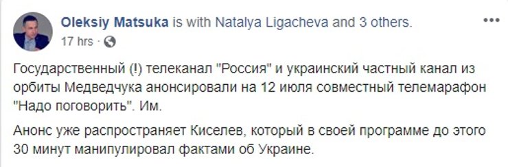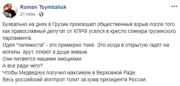 Тем временем в соцсетях ищут причины, почему идея телемоста вообще возникла. Основная версия, что в больше всего пользы от скандала получит Виктор Медведчук, которого, несмотря на все отговорки, связывают с телеканалами "112-Украина", "NewsOne" и теперь еще и "ZIK" (каналы принадлежат нардепу от Оппозиционного блока Тарас Козак, который сейчас баллотируется в раду по списку "Оппозиционной платформы"). По мнению пользователей, ему был важен не так сам телемост, как протесты против него, при этом, желательно в радикальной форме. В таком случае Медведчук смог бы развивать тему притеснения свободы слова в Украине и угрозы со стороны "партии войны" для наращивания рейтинга своей политсилы.