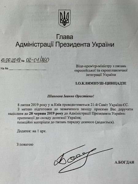 Кроме того, Рябчук опубликовал письмо главы ОП Андрея Богдана от 13 июня к вице-премьеру с предложением до 28 июня прислать пожелания по составу украинской делегации на саммит.