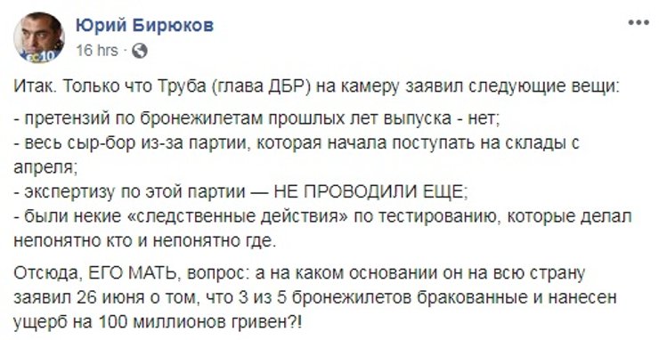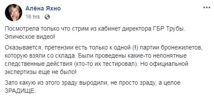 Но во время беседы с Романом Трубой, которая записывалась на видео, выяснилось, что скандал с бронежилетами несколько раздут. Поскольку экспертиза не проводилась, а "из винтовки Мосина" был прострелен один жилет. На основании чего и были сделаны выводы о его некачественности.