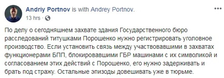 Татьяна Чорновол в своем посте рассказала, что напрямую спросила директора ГБР, "почему не сидит Андрей Портнов, агент Кремля и юрист режима Януковича", на что Труба ей ответил, что этот вопрос не в компетенции ГБР. Также у народного депутата был вопрос, почему в ГБР расследуется по заявлению того же Портнова дело про факт организации контрнаступления Украинских вооруженных сил, в результате которого от боевиков были освобождены Славянск, Бахмут и Северодонецк. По словам Чорновол, директор ГБР не дал ей ответа на данный вопрос и всячески уклонялся от ответа.