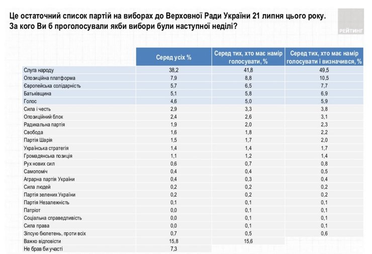 - Согласно данным соцпроса "Рейтинга", который проводился с 6 по 10 июля, партию "Слуга народа", поддерживают 47% тех, кто намерен голосовать и определился с выбором. За "Оппозиционную платформу – За жизнь" тогда готовы были проголосовать 11,6% определившихся, за "Голос" – 6,6%, за ВО "Батькивщина" – 6,4%, а за "Европейскую Солидарность" – 8,2%.