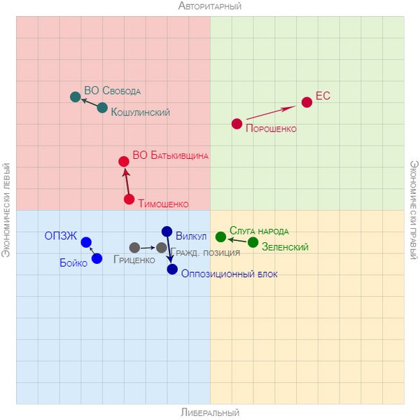 Фокус уже запускал аналогичный тест накануне президентских выборов и, несмотря на замену пары вопросов, определенный интерес вызывает сдвиг политических позиций. К примеру, партия Европейская солидарность на этих выборах оказалась куда "правее", чем ранее был Петр Порошенко. Что может быть связано с тем, что теперь у политика и его соратников нет необходимости быть "ближе к народу". В результате чего впервые в истории Украины мы можем наблюдать появление по-настоящему правоконсервативной партии. В то же время "Слуга народа" оказалась несколько "левее" Владимира Зеленского, который в интервью Гордону говорил о том, что чиновники, министры и депутаты должны получать большие зарплаты. Глава партии Дмитрий Разумков не стал защищать эту позицию и выразил мнение, что у депутатов и руководителей госкомпаний зарплаты не должны значительно отличаться от зарплат обычных людей. Аналогичные перемены произошли и по ряду других вопросов.