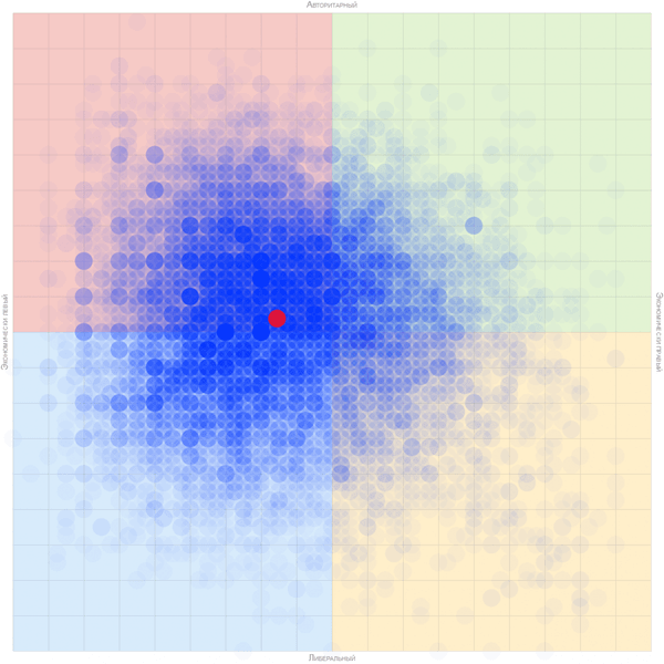 Все результаты на одной диаграмме. По вертикальной оси разные координаты подразумевают разные взаимоотношения между государством, обществом и человеком (чем выше -- тем авторитарнее/коммунитарнее, чем ниже -- тем либеральнее/либертарнее), по горизонтальной -- разное отношение к вопросам государственного контроля над экономикой и перераспределению благ (чем левее -- тем "левее" и наоборот).