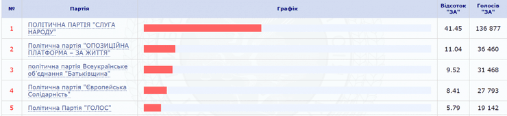 - Согласно финальным данным национального экзит-полла, в Раде будут представлены пять партий. Свои фракции в парламенте сформируют "Слуга народа" (44,2%), "Оппозиционная платформа – За жизнь" (11,4%), "Европейская солидарность" (8,8%), ВО "Батькивщина (7,4%) и "Голос" (6,5%).