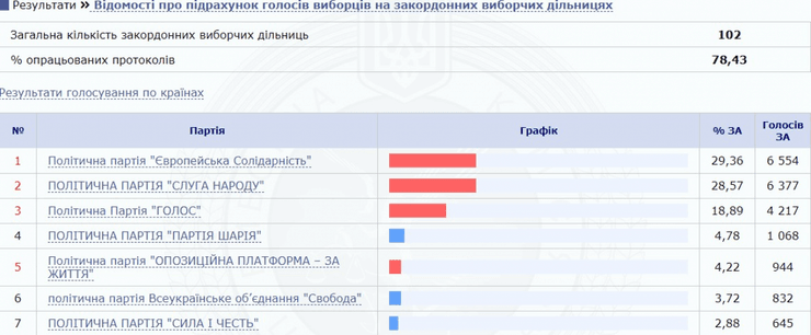 По результатам обработки 78,43% электронных протоколов голосования на зарубежных избирательных участках наибольшую поддержку избирателей получила партия "Европейская солидарность".