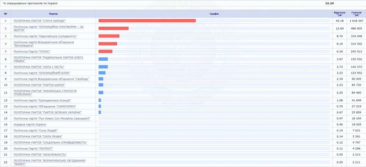 ЦИК обработала 32,29% бюллетеней. В Раду проходят пять партий.