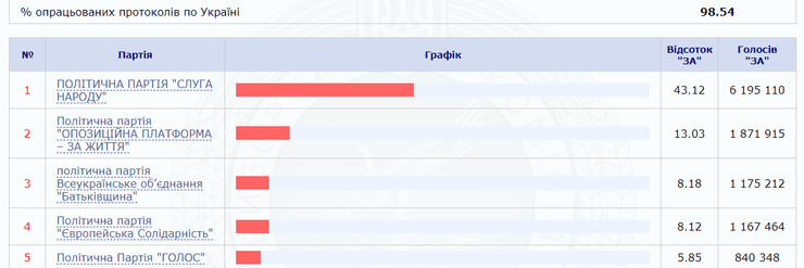 Центральная избирательная комиссия обработала 98,54% электронных протоколов об итогах голосования в многомандатном общегосударственном избирательном округе на внеочередных выборах народных депутатов Украины.