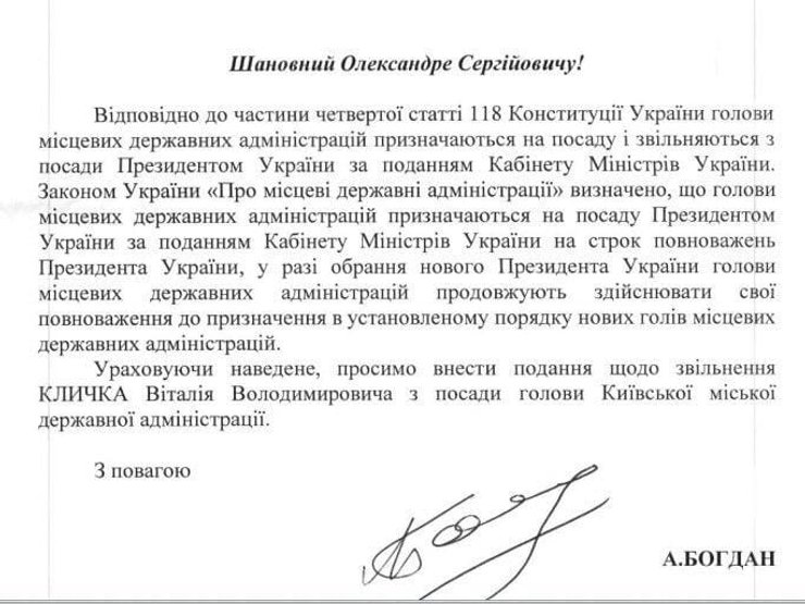 Несмотря на все вышеизложенное, президент оказался настойчив в своем желании сменить главу КГГА на своего человека, в результате чего сегодня Андрей Богдан направил письмо с обращением к Кабмину с просьбой уволить Виталия Кличко с поста главы КГГА. Письмо адресовано министру Кабинета министров Александру Саенко, который отвечает за реализацию приоритетных реформ и координацию работы Секретариата Кабмина, а также руководит Офисом реформ Премьер-министра Украины. Решение аргументировано 118 статьей Конституцией Украины. В документе говорится о том, что Кличко может быть уволен в связи с тем, что главы местных администраций назначаются и увольняются Президентом Украины по представлению Кабмина.