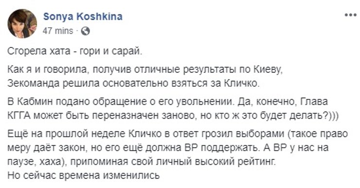 Впрочем, Кличко останется избранным мэром Киева до новых местных выборов, которые, по слухам, должны состояться досрочно, скорее всего, осенью 2019 года. О такой вероятности говорил представитель главы государства в Верховной Раде Руслан Стефанчук. Он заявил, что в Офисе президента рассматривают возможность проведения досрочных выборов в органы местного самоуправления "Будет это осуществлено следующей осенью или это может быть осуществлено еще и до этого — мы рассматриваем разные варианты, как наиболее эффективно перезагрузить всю системы, которая касается отношений "власть и человек". Также он заявил, что в президенты Зеленский шел с четким пониманием необходимости сменить всю систему власти, а не отдельных ее представителей. "Если ты бросишь свежий огурец в бочку с прокисшими огурцами, он станет прокисшим огурцом", — резюмировал Стефанчук.