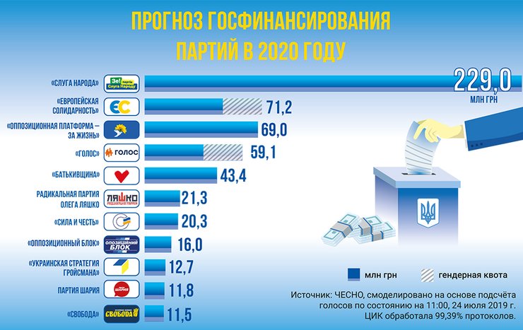 Опираясь на предварительные результаты выборов, можно спрогнозировать, что в 2019-м на получение госсредств будут претендовать одиннадцать партий. Среди них как те, кто проходит в Раду — "Слуга народа", "Оппозиционная платформа — За жизнь", "Европейская Солидарность", "Голос", "Батькивщина", — так и те, что набирают не менее 2%, — Радикальная партия, "Сила и честь", "Оппозиционный блок", партия Шария, "Украинская стратегия Гройсмана" и ВО "Свобода".