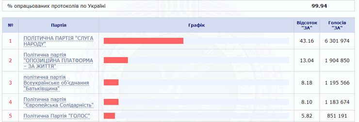 За партию “Слуга народа” проголосовали 43,16% избирателей