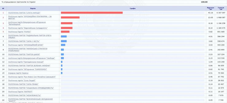 По данным Центризбиркома, за партию "Слуга народа" проголосовали 43,16% избирателей, у "Оппозиционной платформы — за життя" — 13,05%.