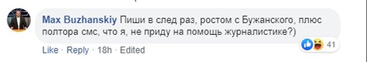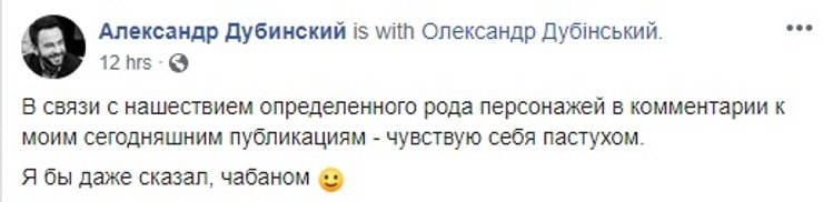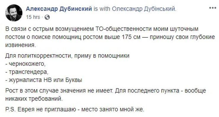 Дубинский отреагировал на критику сразу двумя постами, но уже на другой странице в Facebook. В одном написал, что "шуточным постом" никого не хотел оскорбить и рост значения не имеет. А в другом отметил, что после такого количества гневных комментариев чувствует себя "чабаном". Также, в комментариях под скандальным постом он несколько раз писал, что у критиков нет чувства юмора.