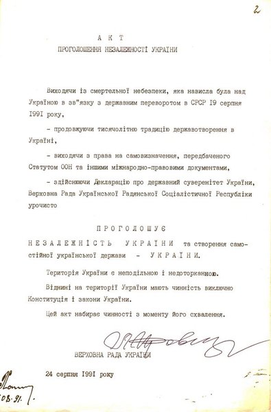 24 августа 1991 года Верховная Рада Украинской ССР принял Акт провозглашения независимости, которым, "исходя из смертельной опасности, нависшей было над Украиной в связи с государственным переворотом в СССР 19 августа 1991 года, продолжая тысячелетнюю традицию государственного строительства, исходя из права на самоопределение и осуществляя Декларацию о государственном суверенитете Украины", была торжественно провозглашена независимость и создание Украины как самостоятельного государства.