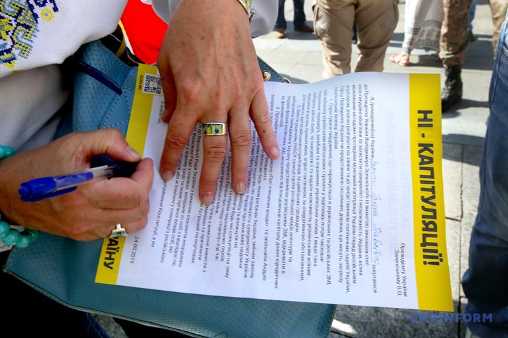 Протестующие держали в руках государственные флаги и подписывали письма-обращения к президенту Зеленскому.