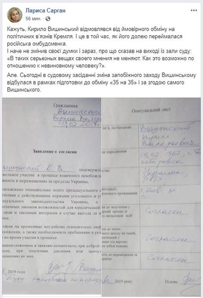 Кроме того, Сарган опубликовала скан-копию заявления Вышинского о согласии на участие в обмене удерживаемыми с РФ.