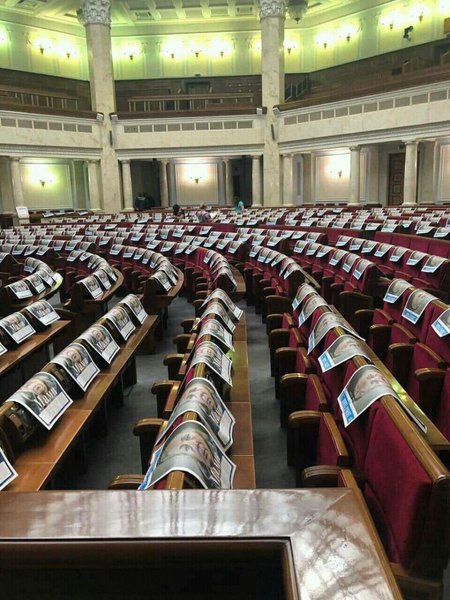Кроме этого, сегодня на своих рабочих местах новоизбранные депутаты нашли спецвыпуск газеты "Зеркало недели", целиком состоящий из более чем 300 фото матерей, потерявших своих сыновей на войне.