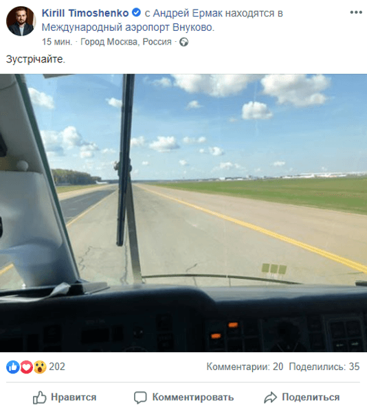 Замглавы Офиса президента Кирилл Тимошенко написал лаконичный пост в Facebook с текстом "Встречайте".